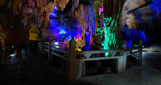 波月洞的“鵝管”長(zhǎng)短不一,參差錯(cuò)落,密密匝匝,直掛天穹,在逆光燈照下,如萬(wàn)千瑪瑙翡翠垂吊空間,晶瑩剔透,閃閃發(fā)光;觀之,不能不驚吧大自然神奇的創(chuàng)造力。